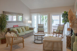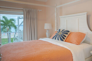 The villa bedrooms feature 2 bedrooms each with queen beds and a third bedroom with 2 queen beds. Each bedroom has its own bathroom. The villa is decorated with high end furnishings, has vaulted ceilings, a spacious living area with a flat-screen TV and a fully equipped kitchen with refrigerator, stove, microwave, dishwasher and ice maker. The villa also has a washer and dryer.